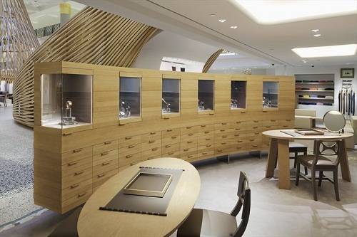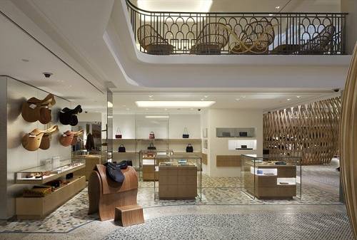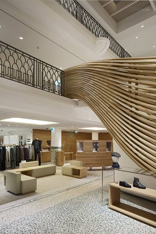 Denis Montel, direttore artistico dell’atelier RDAI, ha curato e seguito il progetto del nuovo store della celeberrima maison Hermès, a Parigi che si trova ospitato all’interno di un’antica piscina in stile art nouveau Lutetia, eletta monumento nazionale nel 2005. Montel ha dato vita a dei veri e propri bozzoli in legno di frassino intrecciato che contengono la collezione “Homme”, perfettamente incastonati tra colonne, pavimenti ricoperti da mosaici e ringhiere in ferro battuto risalenti agli anni ’30. L’intero store emana lusso e semplicità nel contempo. Le forme ottenute sono estremamente fluide e leggere, tanto flessibili da ricordare il movimento naturale di un oggetto nell’acqua, quasi una sorta di delicatissima danza degli equilibri. Al piano terra le pareti stesse formano curve e onde che cambiano di volta in volta forma per adattarsi alle vetrine e alla disposizione degli scaffali, diventando anche panchine. La scala che collega il pianterreno al primo piano si snoda sinuosa come fosse un nastro che cade naturalmente dall’alto seguendo il flusso di un cascata di legno. Un perfetto esempio di intervento architettonico forte ma anche dolce e avvolgente, come un bozzolo di seta.