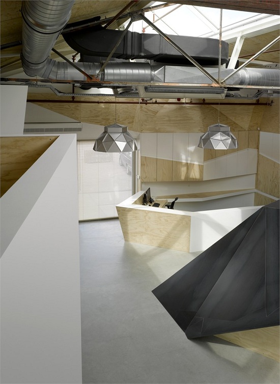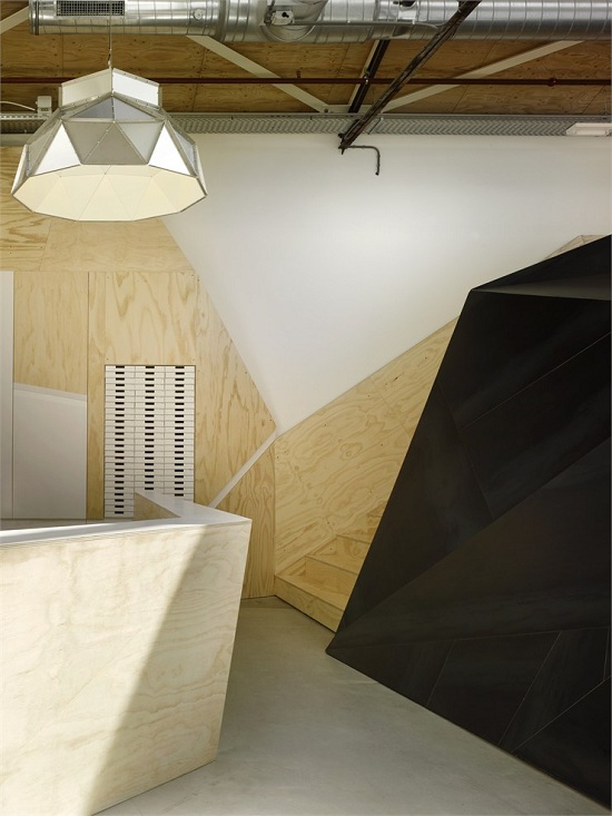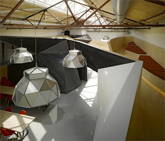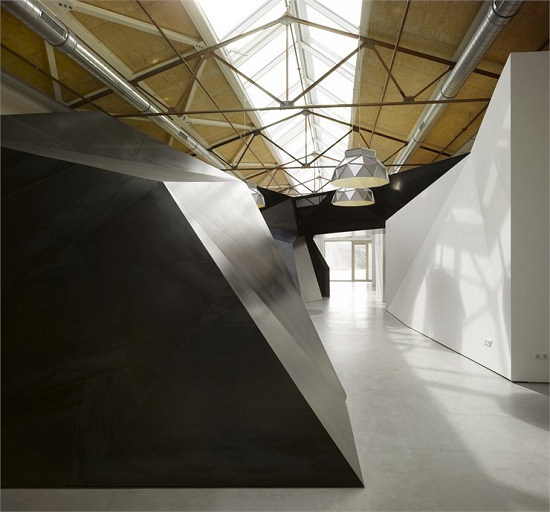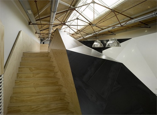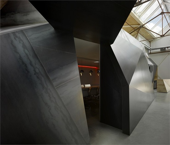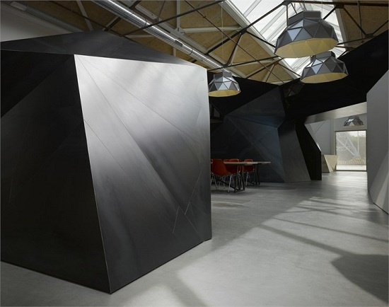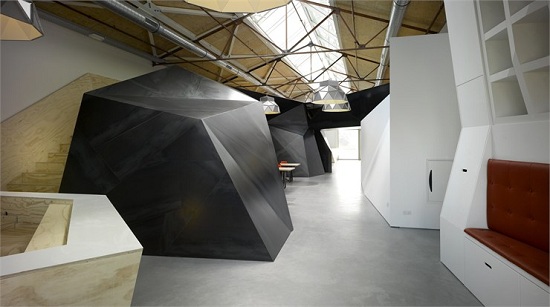 "Per progettare lo spazio interno, abbiamo puntato a recuperare la filosofia Red Bull, dividendo gli spazi secondo il loro uso e secondo lo spirito, per suggerire l'idea dei due emisferi opposti e complementari della mente umana, la ragione contro l'intuizione, l'arte contro l'industria, il buio contro la luce, l'ascesa di un angelo contro la menzione della bestia. Il nostro obiettivo è stato combinare la semplicità quasi brutale di un edificio industriale con la filosofia Red Bull. L'architettura degli interni con i suoi molteplici livelli di significato trasmette questa doppia personalità, che all'ospite ricorda un momento gli strapiombi di montagna e l’attimo successivo le rampe da skate board. Questi volumi sfaccettati a triangoli, come strappati dal corpo di una nave, costruiscono spazi semi-aperti, che possono essere visti dal basso, come nicchie, o dall'alto, come ponti e soppalchi che si estendono attraverso lo spazio"